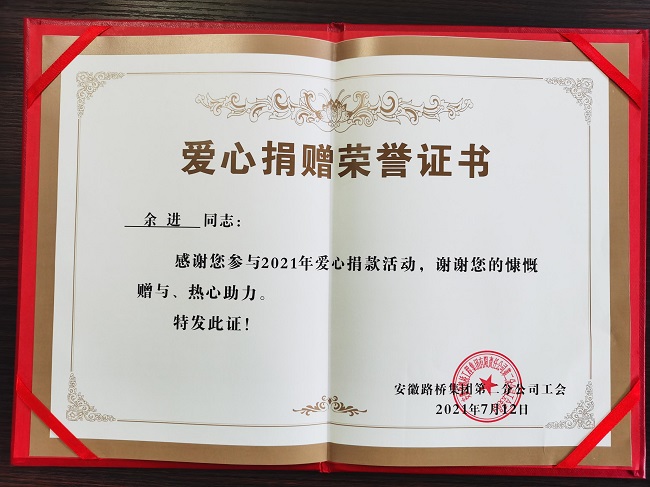 作为一名应届毕业生,与同期员工相比,他算不得优秀,平凡的容易让人遗忘。可就是他这样一个不起眼的人,却在爱心捐款中捐出千元。他的家庭条件并不富裕,一直和父亲生活,在生活上十分节俭。捐款当天,他还在现场拌合站值守,当他在群里得知消息后,未曾有丝毫迟疑,立刻通过微信转账的方式捐款1000元。1000元虽说不多,但却也是他月工资的三分之一,当同事问他是不是转错了,电话那头的余进淡淡地说了句,“就是这个,没转错,我就想出点力帮个忙”。