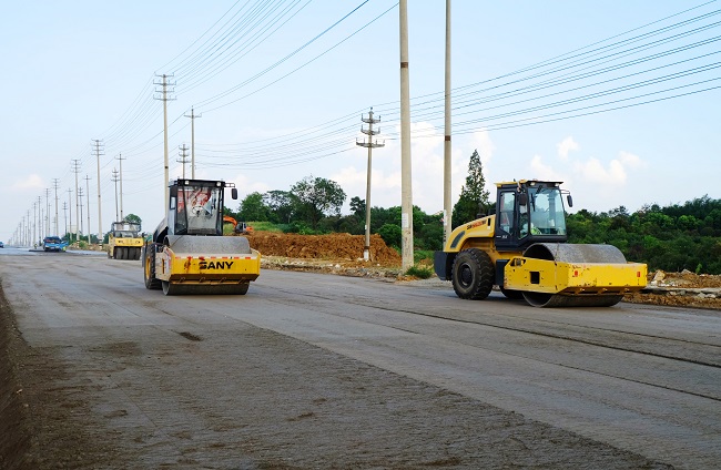本次水泥稳定碎石基层摊铺全长1480米,宽15米。54+60~44+00段右幅第一层水稳摊铺完成,压实厚度20cm;59+80~55+60段右幅第二、三层水稳两层联铺摊铺完成,压实厚度共计36cm。8月9日,一工区0+00~11+00段右幅主车道、0+00~9+60段右幅辅道沥青摊铺顺利进行。沥青摊铺现场,机械轰鸣,料车穿梭,2台沥青摊铺机与8台各型压路机同时作业。