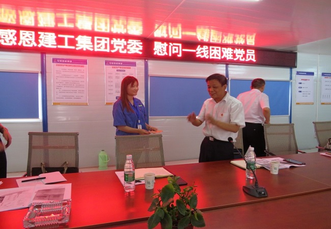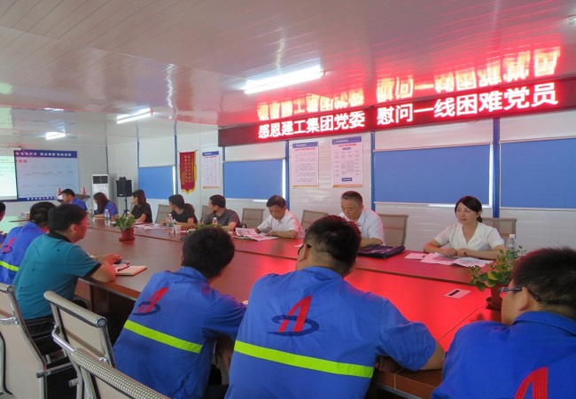 宋书记一行抵达项目部后,代表集团党委向项目党员致以节日问候,对困难党员张孟云进行看望慰问,送上慰问金,并勉励张孟云同志,困难是暂时的,号召项目党员群众对张孟云同志多关心、多照顾,帮助其渡过难关。