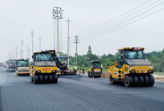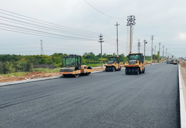施工现场,沥青摊铺机、压路机、自卸卡车等机械有序作业。为了打造品质工程,项目严格把控沥青原材料、生产、运输、摊铺、碾压等各个环节;为保证道路平整度,现场两台摊铺机同步推进,多台双钢轮压路机和轮胎压路机组合碾压。同时,拌和站和现场施工人员实时监测沥青混合料的出料温度、摊铺温度和碾压温度,有效避免了因温度导致压实度不均匀的现象。摊铺过程中,现场施工人员按照施工方案进行标准化作业,严格控制摊铺与碾压等各工序衔接,保障摊铺路段沥青路面各项指标达到设计要求。