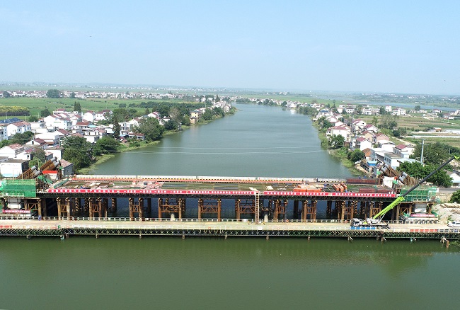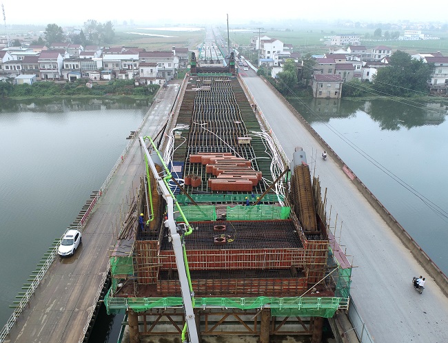 G347PPP华阳河大桥主桥为单跨130m下承式钢管混凝土系杆拱结构,横跨整个华阳河,全程需涉水施工,且新建桥右幅紧邻老桥,作业施工场地狭小,施工组织难度大。为确保主桥拱座、端横梁浇筑顺利完成,项目精心组织,合理安排,关键工序控制到位,从劲性骨架安装到钢拱端钢管吊装定位、混凝土浇筑等各个工序,层层落实,并安排专人进行实时监控量测,选定合适的振捣方式和浇筑次序,密切关注浇筑全过程。经过20多个小时的连续奋战,共浇筑混凝土540余方,华阳河大桥主桥9#、10#拱座、端横梁浇筑工作顺利完成。