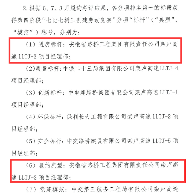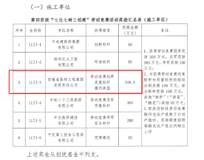 9月26日,栾卢高速03标项目业主单位组织所辖各标段举行“七比七树三创建”劳动竞赛活动。公司栾卢高速03标项目在与其他5家央企的同台比武中脱颖而出,一举斩获“劳动竞赛冠军、进度标杆奖、履约典型奖”三大奖项,在所有参建单位中,名列第一名,荣获奖励金额516.8万元。