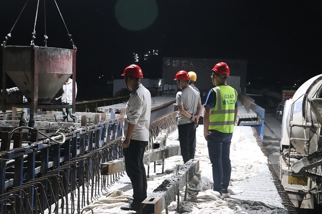 经过10多个小时的连续作业,10月3日晚,G347PPP杨湾河预制梁场顺利完成最后一片混凝土箱梁预制工作。