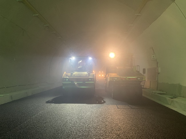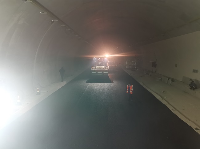 为确保隧道沥青砼路面施工能够保质保量完成,项目部加班加点施工、人机不歇,施工前对现场技术员和沥青施工班组进行技术交底,加大下承层检查,严格控制施工过程中沥青平整度、碾压到边,确保压实度合格。沥青砼面层施工前已完善通风、照明等安全保障措施,确保了隧道内照明光线充足均匀。在沥青砼面层摊铺期间,为确保摊铺机及运输车辆安全行驶,道口有专人负责指挥运输车辆,隧道内施工作业人员严格佩戴安全帽、防毒面具及反光背心,保证施工作业的醒目和安全。