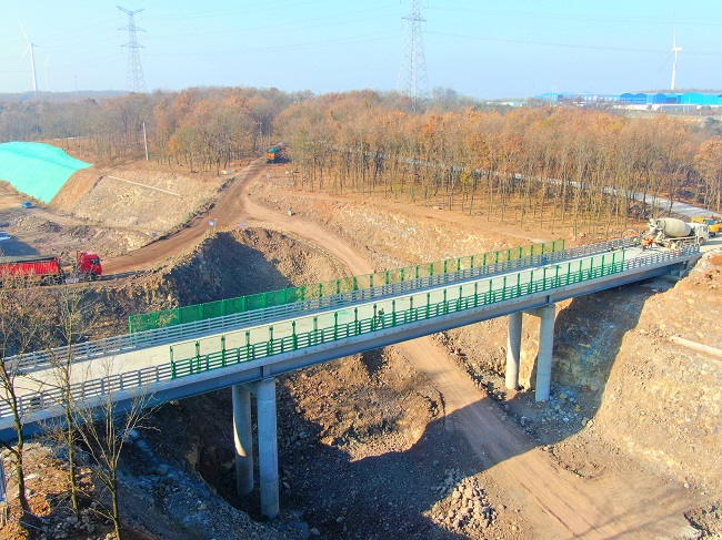 为解决群众“急难愁盼”的出行难题,滁天高速项目将此桥设置为长85m,宽8.5m,上部采用钢板组合梁,先简支后连续,桥面为预制桥面板,两侧安装钢护栏。自2021年9月开始施工,为保证该道路通行和施工安全,项目部因地制宜,科学部署,制定详细的安全导改和施工专项方案,围绕天桥节点目标倒排工期计划,加大人员设备投入,加班加点,快速推进桩基、墩柱、桥面板架设等各项施工任务,并在天桥两侧顺延混凝土路面600余米以改善通行路况,历时3个月,最终如期完成天桥通行节点目标。