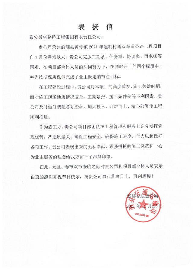 12月25日,六分公司泗县黄圩镇项目收到泗县交通运输局发来的表扬信。信中对项目部展现出的无私奉献、顽强拼搏的施工风范和一心为业主服务的理念提出高度赞扬。