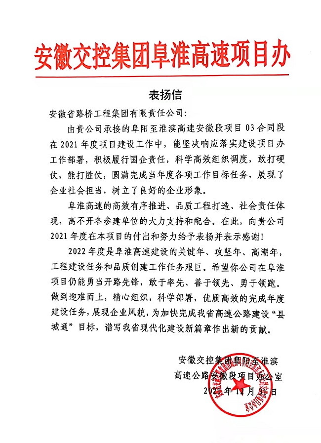 12月31日,安徽交控集团阜淮高速项目办向安徽路桥集团发来表扬信和表彰函,对阜阳至淮滨高速公路安徽段03标项目以高质、高效克服施工难题,圆满完成年度各项工作目标任务给予了充分肯定和赞扬。