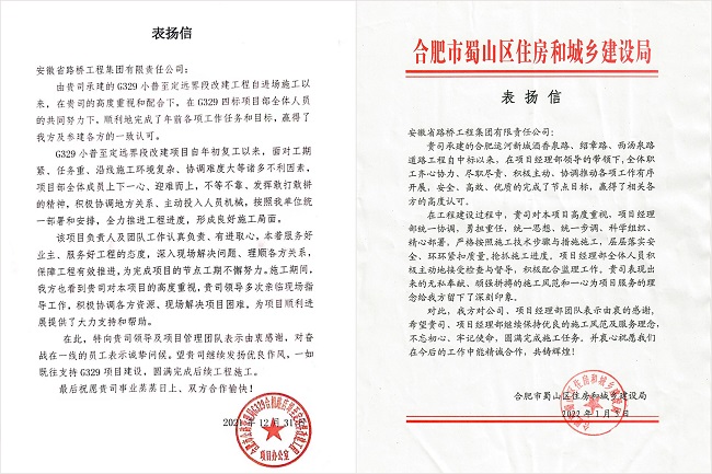 近日,我公司承建的G329小普至定远界段改建项目,合肥运河新城酒香泉路、绍章路、西汤泉路道路工程项目先后荣获业主来信表扬,两项目业主对我公司项目高标准、高质量完成节点任务予以高度认可和赞扬,对公司以及项目管理团队表示衷心的感谢。