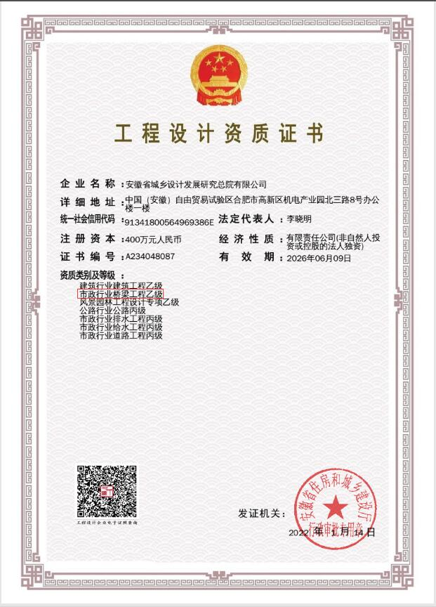 城乡设计总院自组建以来,在全面做好服务公司主业的同时,高度重视企业资质申报工作,差异化布局公司主业关联业务的拓展。2021年以来,已相继获批各类别资质9项,取得在工程测量、建筑工程、风景园林等专业领域的新突破,实现公司在勘察设计专业上的再扩围。