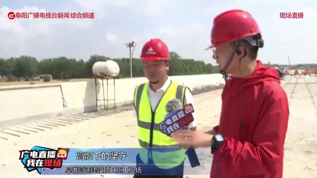 2022年6月21日,阜阳广播电视台赴安徽路桥集团阜淮高速03标项目进行采访,重点报道广大建设者们为保证项目工期如期完成,战高温、迎“烤”验,坚守岗位,用汗水诠释责任。