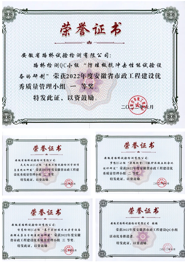 “防眩板抗冲击性能试验设备的研制”荣获2022年度安徽省市政工程建设优秀质量管理小组一等奖;“道路工程试验检测管理信息系统的研发”、“梁端配重C30铁砂混凝土配合比设计研究”荣获2022年度安徽省市政工程建设优秀质量管理小组二等奖;“基于实时技术的力学设备数据采集与分析系统的研发”荣获2022年度安徽省市政工程建设优秀质量管理小组三等奖。同时,作为检测公司QC小组活动的推进者——检测公司党总支委员、副总经理张鹏还获得了“2022年度安徽省市政工程建设QC小组活动优秀推进者”荣誉。