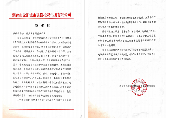 7月12日,安徽路桥集团收到业主发来的感谢信,对山东栖霞市松山污水处理厂及配套管网工程EPC项目借调在业主单位工作的李德霞同志、王明伟同志给予高度赞扬。
