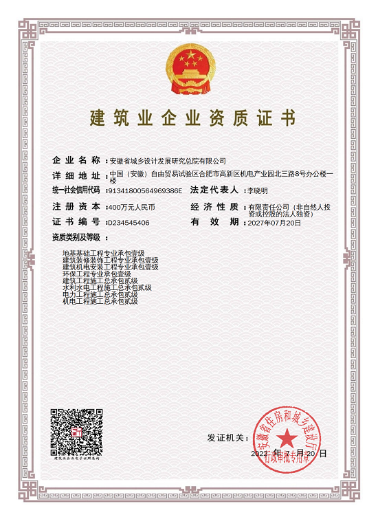 7月19日,城乡设计总院增项获批环境卫生工程设计乙级资质,7月22日再获装修装饰工程、建筑机电工程专业承包一级、电力工程总承包二级资质,施工类别资质已达八项。