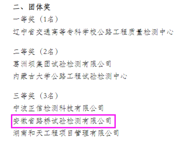 为全面提升公路试验检测人员的理论水平和业务技能,引导行业树立比、学、帮、促的学习风气,2022年7月29日,中国交通建设监理协会在武汉举办了首届中国公路工程试验检测技能竞赛。检测公司喜获两个类别奖项,成为安徽省唯一一家进入团体全国前六强的机构。
