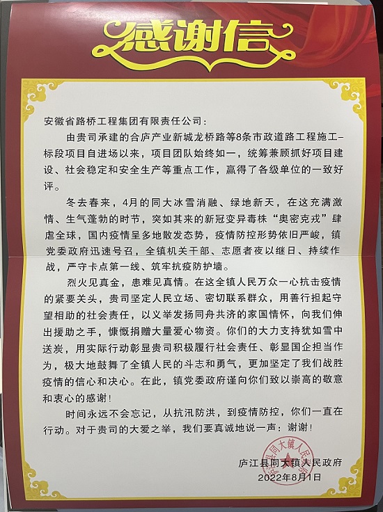 感谢信中指出,今年4月以来,国内疫情呈多地散发态势,疫情防控形式严峻依旧。烈火见真金,患难见真情。在抗击疫情的紧要关头,安徽路桥集团坚定人民立场、密切联系群众,向属地政府捐赠防疫物资,并多次前往各交通要到防疫卡点开展慰问活动,极大鼓励了全镇人民的斗志和勇气,坚定了战胜疫情的信心和决心。从抗汛防洪到疫情防控,镇党委政府向公司积极履行社会责任、彰显国企责任担当的行为致以崇高的敬意和衷心的感谢。