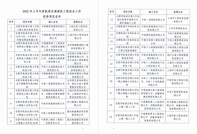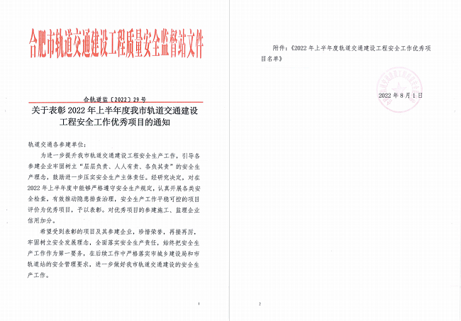 文件指出,2022年上半年,合肥市轨道交通7号线项目严格遵守安全生产规定,认真开展各类安全检查,有效推动隐患排查治理,安全生产平稳可控,被评为优秀项目,予以表彰,并给予公司信用加分。