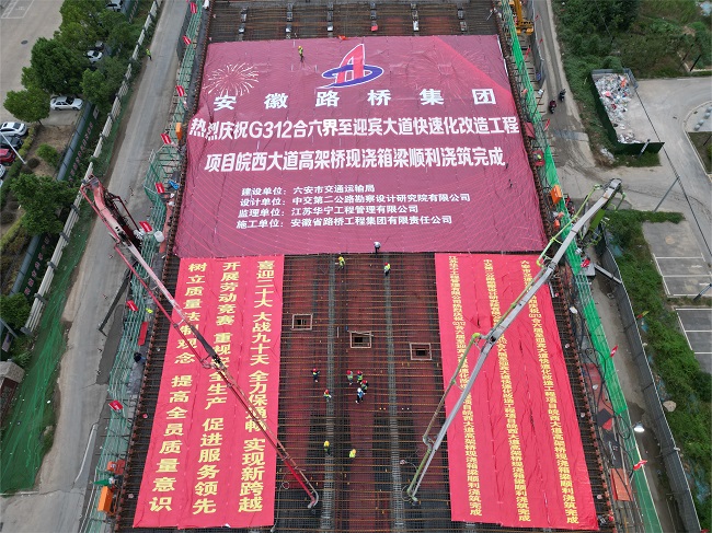 据了解,皖西大道桥高架桥梁起讫桩号为K610+990-K611+918,东接皋陶大道桥,西至淠杭干渠桥,桥梁全长928米。该桥上部结构为小箱梁,现浇箱梁,钢-混组合梁三种形式。本次完成浇筑的现浇梁位于本桥前三联,共11跨,长度330m,现浇箱梁梁高为2.2m,箱梁采用斜腹板截面,箱梁顶宽27m~40.5m~36.5m,左右各有上下桥匝道桥1座。现浇梁梁体施工于6月初开始,于8月底结束,历时3个月完成。