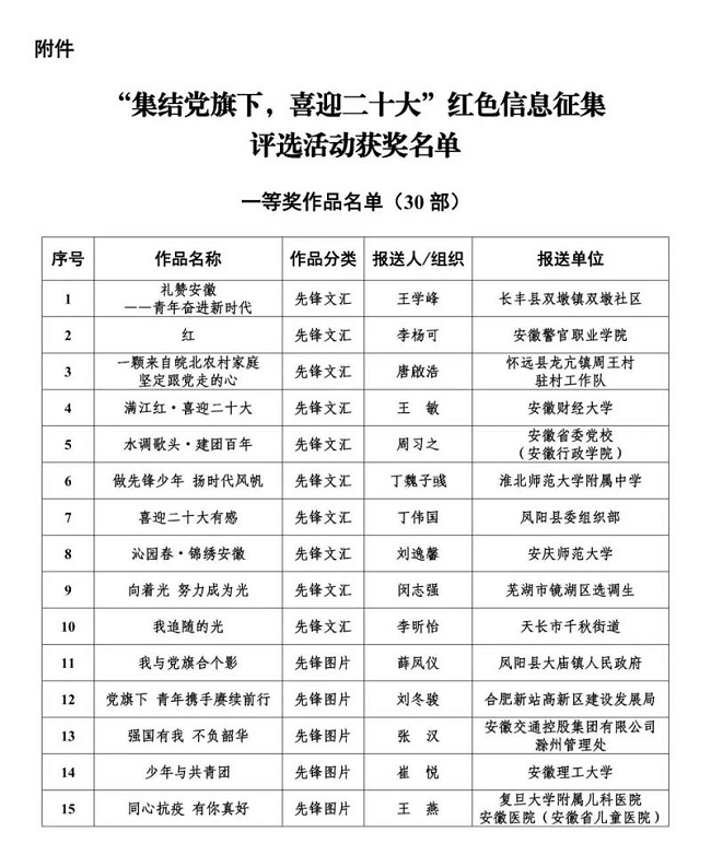 据悉,本次红色信息征集评选活动自2022年4月底启动以来,得到全省各级党(团)组织、广大青年党(团)员的踊跃参与,共征集作品12700余部,网络浏览量839.6万人次,作品点赞510余万人次。活动设“先锋视频、先锋文汇、先锋图片”3个类别,共评出一等奖作品30部、二等奖作品60部、三等奖作品90部,优秀组织奖单位17个。(获奖名单详见安徽先锋网)
