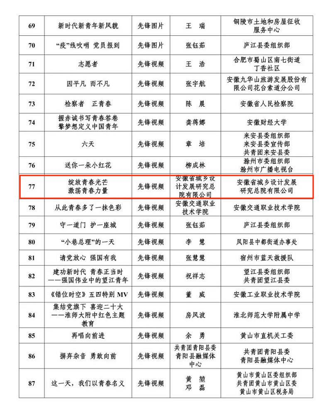 近期,由安徽省委组织部联合团省委、省学联组织的“集结党旗下,喜迎二十大”红色征集评选活动圆满结束,城乡设计总院选送的《绽放青春光芒,激荡青春力量》短视频作品荣获二等奖的好成绩!