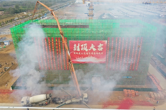 2022年9月25日上午9时58分,随着最后一方混凝土浇筑完毕,安徽建工交通智造公司科研办公楼顺利完成封顶。