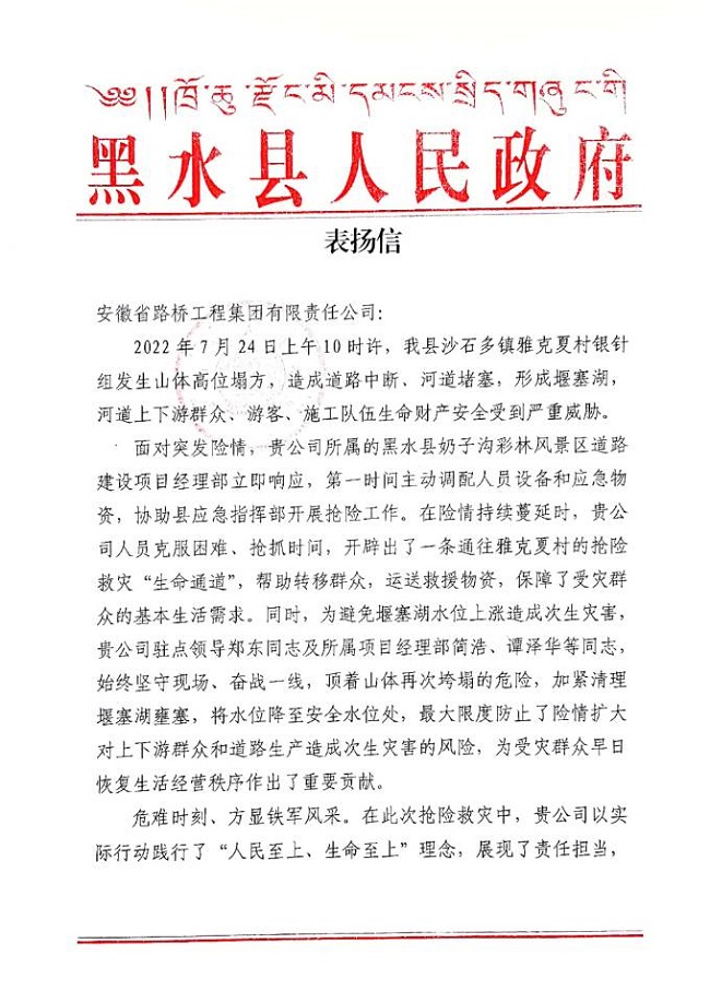近日,黑水县人民政府向安徽路桥集团发来表扬信,对项目建设者在当地出现塌方险情时,践行“人民至上、生命至上”理念,积极参与抢险救灾的行为表达衷心地感谢,致以崇高的敬意。