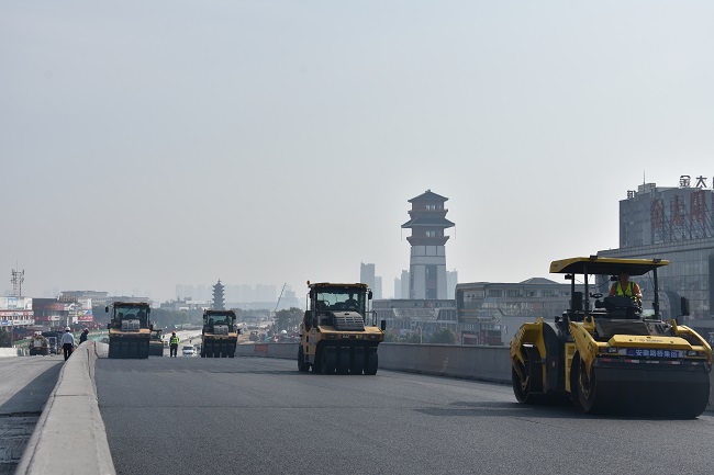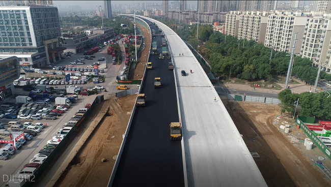 迎宾大道高架桥,作为本项目的控制性工程,为项目最长的一座高架桥,全桥共39跨,其中预制箱梁35跨315片、钢箱梁4跨48段,该桥全长1272.5米。本次左幅沥青摊铺为中面层6厘米厚AC-20C,共计16000㎡。下一步,项目部将进行上面层4厘米厚AC-13C沥青摊铺、右幅沥青摊铺以及伸缩缝安装、标线施工、路灯安装等后续工作。
