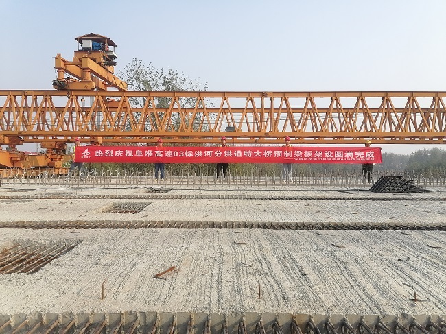 10月23日,阜阳至淮滨高速公路安徽段FH-03标圆满完成洪河分洪道特大桥梁板架设任务。