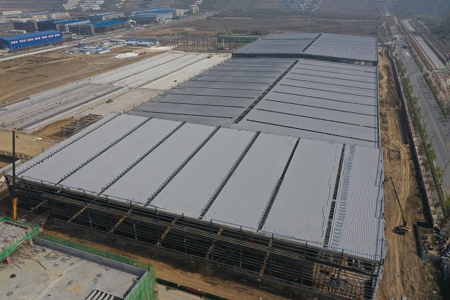 钢结构1#重钢厂房于2022年7月正式开工建设,总建筑面积51049.46m2,总长度400m,最大建筑高度达22.5m。经参建各方积极配合、相互协调,及时纠偏,克服了资金、疫情、高温、雨水天气等因素的影响,从基础开挖到厂房封顶,仅历时4个月,以“智造速度”书写了交通智造新篇章。
