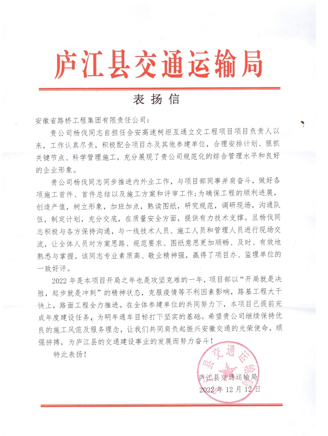近日,合肥市庐江县交通运输局向路桥集团发来表扬信,对合安高速柯坦互通项目在建设中展现出的科学管理、国企担当及项目班子建设给予高度肯定和表扬。