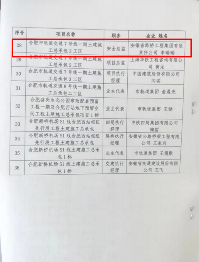 近日,安徽路桥集团承建的合肥市轨道交通7号线(二工区)项目荣获2022年度合肥市轨道交通建设工程安全工作优秀项目,项目安全总监李瑞瑞获安全工作先进个人。