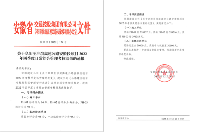 近日,阜淮高速项目办组织阜淮高速项目、中心实验室、监理公司等开展第四季度日常综合管理考核活动,阜淮高速03标项目综合评分再次喜获“第一名”的好成绩!同时也成为该工程项目自开工以来,唯一一个连续三次荣获季度评比第一名的标段。