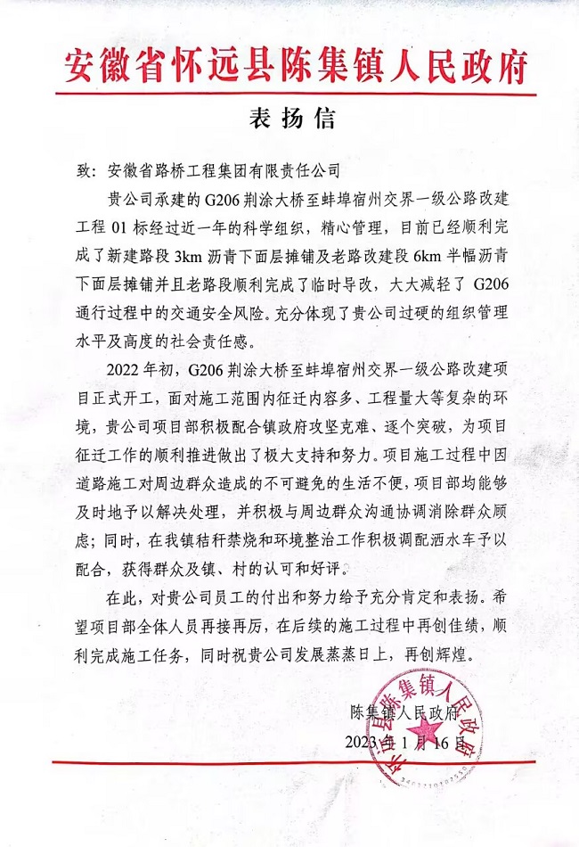 近日,蚌埠市怀远县陈集镇人民政府向安徽路桥集团发来表扬信,对G206荆涂大桥至蚌埠宿州交界一级公路改建工程01标项目团队的辛苦付出和所作努力给予充分肯定和表扬。