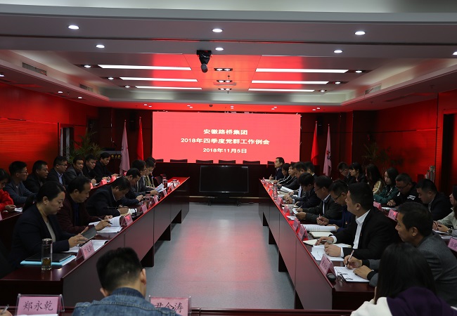 11月5日下午,安徽路桥集团在安建大厦8楼会议室召开2018年四季度党群工作例会。公司党委书记、董事长盛明宏,公司党委委员、工会主席王永来出席会议,公司党委委员、纪委书记王胜利主持会议。所属各基层党总支、支部、工会、团组织主要负责同志及公司机关党群部门负责人参加会议。