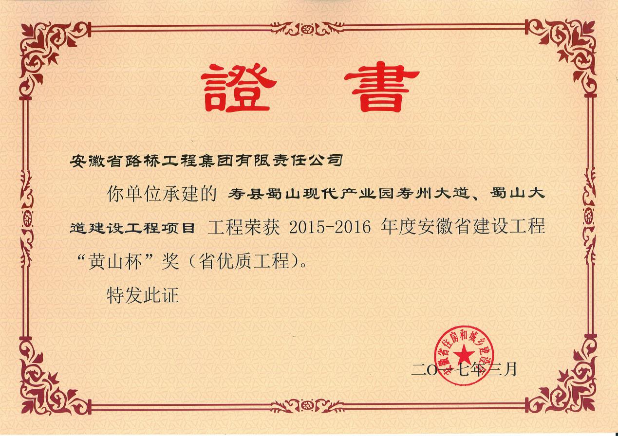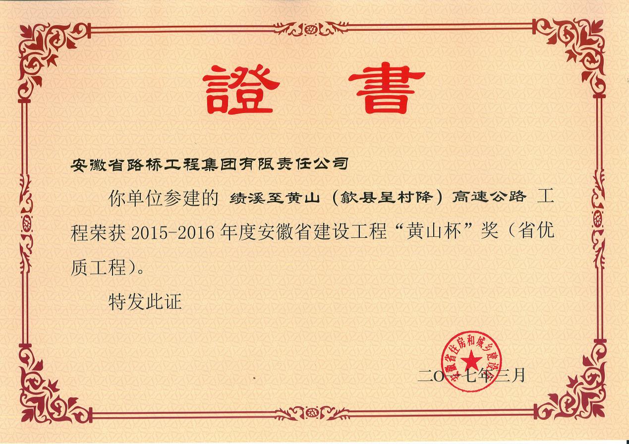 近日,安徽省建设厅发文公布了2015-2016年安徽省建设工程“黄山杯”获奖项目名单,我公司承建的绩溪至黄山(歙县呈村降)高速公路、巢湖安成路(东塘路-亚父路)工程、寿县蜀山现代产业园寿州大道、蜀山大道建设工程3个项目荣获该殊荣。