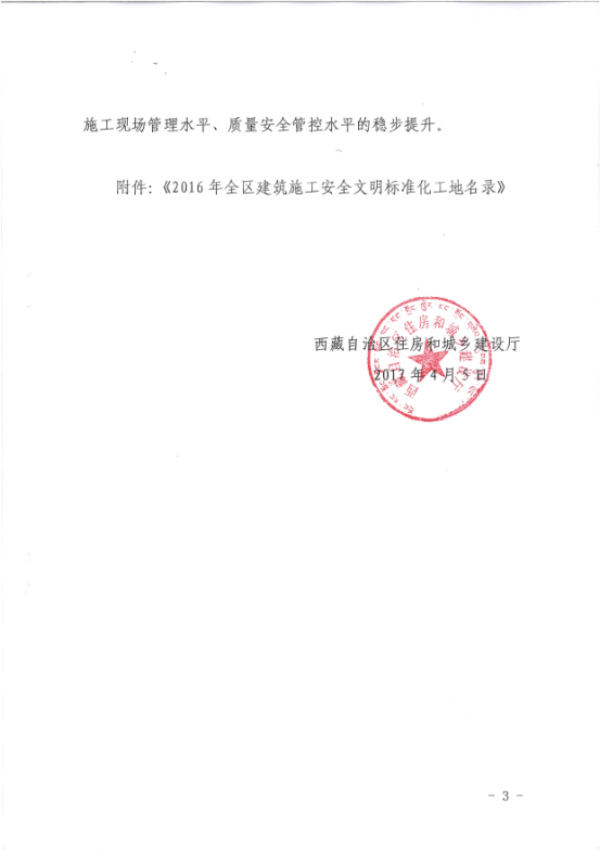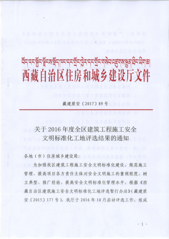 经过一系列有力措施,施工一年多来,该项目未发生一起安全事故。安全文明施工达到标准化和常态化,施工现场文明整洁,营造了安全和谐的施工氛围,受到各方的肯定。经西藏自治区住房和城乡建设厅资料审核、现场勘查、初评、综评、终评等环节考评,最终从百家申报单位中脱颖而出,获评西藏自治区“建设工程施工安全文明标准化工地”,为公司在西藏自治区营造了良好的社会形象。