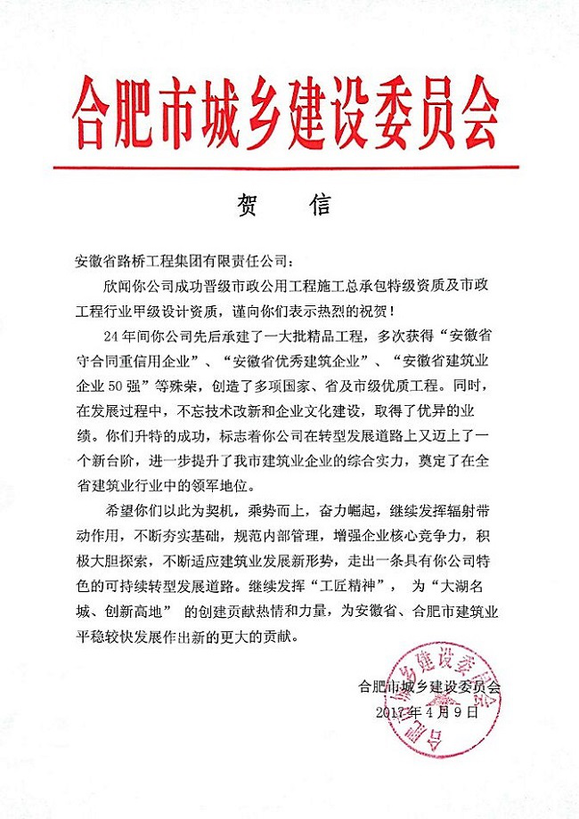 4月1日,经国家住建部核准,安徽省路桥工程集团有限责任公司成功获得市政公用工程施工总承包特级资质及市政行业甲级设计资质。将公司“十三五”战略规划末期计划实施的宏伟蓝图,提前绘就!