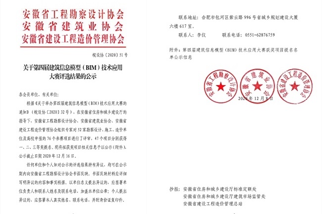 今年,公司依托高新技术企业平台,加大创新力度,进一步提高公司的科技竞争力。课题《城市交通基坑工程施工影响控制与BIM新技术应用》获得安徽省公路学会科技进步一等奖;参编的《再生集料道路基层施工技术规程》获批为安徽省地方标准;获得省部级工法10项,授权专利10项;申报的《G347安九二期望江至宿松段一级公路工程杨湾河特大桥BIM应用项目》荣获第五届中国建设工程BIM大赛单项三类成果、安徽省第四届建筑信息模型大赛二等奖,选送的《肥西县产城融合示范区综合管廊BIM应用项目》在全国“首届工程建设行业BIM大赛”中获奖。