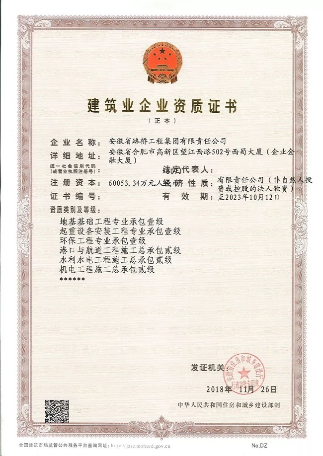 安徽路桥集团人努力拼搏、不断进取再获硕果。11月26日,公司再传喜讯,经安徽省住房和城乡建设厅核准,公司成功取得起重设备安装工程专业承包一级、地基基础工程专业承包一级、机电工程施工总承包二级资质证书。这是继十月份,公司新增环保专业承包一级、港口与航道工程施工总承包二级、水利水电工程总承包二级资质后的又一次增项。此次增项的资质以房建资质为主,为公司未来进入房建领域奠定了良好的基础,此次资质的获得将进一步拓展公司业务范围,提高企业核心竞争力。