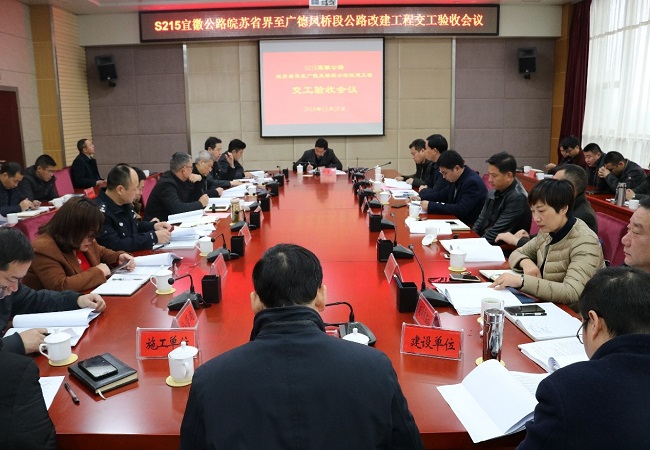在随后召开的验收会上,建设、施工、监理、设计、检测单位及交工验收工作组依次进行了工作情况汇报,交工验收工作组审议了合同段交工验收证书和交工验收报告。经工作组合议,与会人员认为S215宜徽公路皖苏省界至广德凤桥段公路改建工程(PPP)项目整体工程质量等各方面满足设计和规范要求,内业资料齐全,同意通过交工验收。