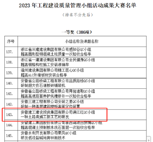 近日,中国建筑业协会公示2023年工程建设质量管理小组活动成果大赛获奖名单,建工建投集团第二分公司满江红QC小组申报的活动成果《一种土路肩施工新工艺的研发》,经安徽省建设工程质量与安全协会推荐,中国建筑业协会专家组审核评定,在2498项QC活动成果中脱颖而出,荣获2023年工程建设质量管理小组活动成果大赛一等奖。
