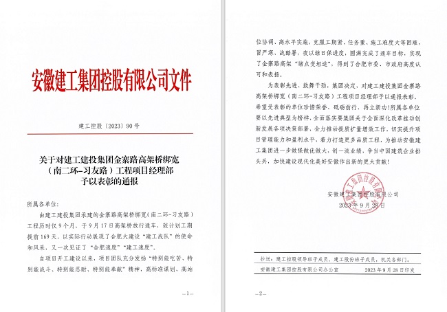 2023年9月28日,建工建投集团金寨路高架桥绑宽(南二环-习友路)工程项目经理部喜获安徽建工集团控股有限公司通报表彰。表彰通报中对建工建投集团在项目建设推进过程中充分展现“合肥速度”“建工速度”给予充分肯定,并号召所属单位以金寨路高架桥绑宽项目为先进典型榜样。