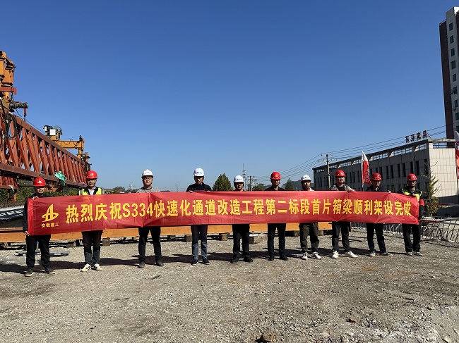 11月6日上午10点,S334(长江南路至繁阳大道段)快速化通道改造工程02标项目首片箱梁顺利架设完成,标志着K9+956.4上跨站前路立交桥正式步入桥梁上部结构全面施工的大干阶段。