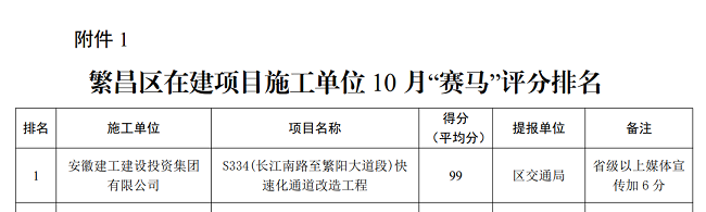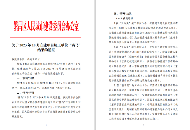 近日,由繁昌区人民城市建设办公室组织的繁昌区在建项目施工单位月度“赛马”评分考核活动中,建工建投集团S334长江南路至繁阳大道段快速化通道改造工程02标项目从参赛的67个施工单位中脱颖而出,以总分排名第一的优异成绩获评“天马奖”!