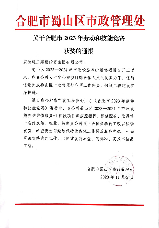 近日,建工建投集团蜀山区2023—2024年市政设施养护维修服务-1标段项目在合肥市市政工程协会主办《合肥市2023年劳动和技能竞赛》活动中表现优异,协助业主取得了第一名的好成绩,获合肥市蜀山区市政管理处通报表扬。