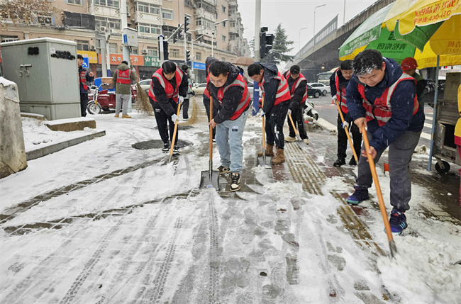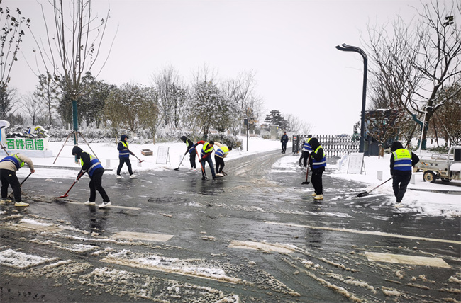 ▲潜山路项目集结23名管理人员,使用铁锹、扫把、融雪剂,辅助2台铲车、1台平板车进行除雪工作,保证潜山路沿线安全通行。
