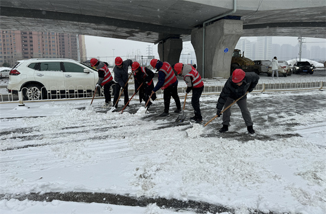 ▲青海路项目由项目经理带队,发动项目班子及普通员工共17人,使用铁锹、扫把、融雪盐,为青海路撒盐铲雪,有效保障了行车安全,为园博园入园观赏的游客提供安全保障。