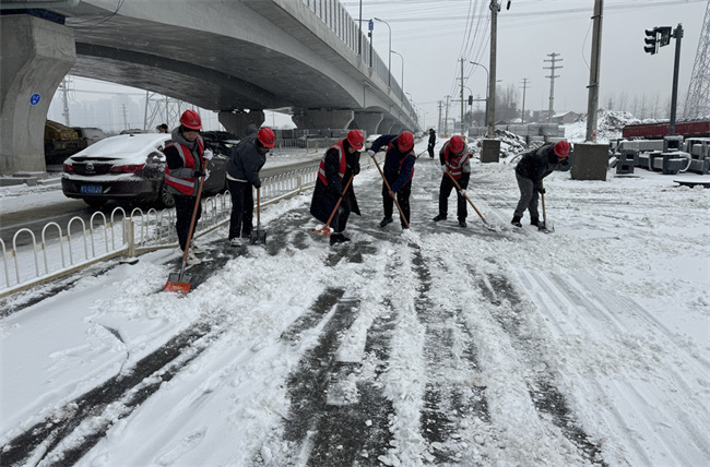 ▲G312合六路(新桥大道-侯店路) 项目15名项目管理人员,使用铁锹、扫把及融雪盐,对北分溪路上跨桥辅道撒盐除雪,保障沿线小区居民及过往车辆安全出行。