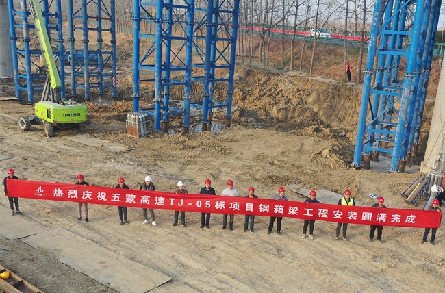 近日,随着最后一片17.8米长的钢箱梁缓缓落到指定位置,标志着五蒙高速05标在全线所有标段中首个完成钢箱梁架设任务。