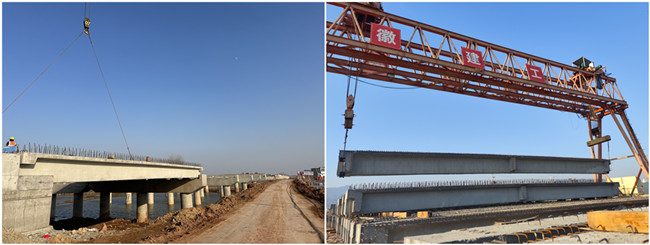 自进场以来,项目部提前谋划、科学组织建设梁场,围绕节点目标,进行任务分解。2023年6月10日启动箱梁首件预制;8月12日首片箱梁在鲁坦河大桥顺利架设。12月26日完成全线桥梁梁板架设。为保证本次架设施工安全,项目部制定详细节点计划,层层压实责任,详细制定运梁、架梁专项施工方案,在梁板运输过程中,整修通道、安排专人盯控,确保预制梁运输安全有序,同时全面细致地对现场施工技术人员进行技术交底和安全质量交底,严格把关每一道施工工序,确保板梁预制、架设等全过程受控。