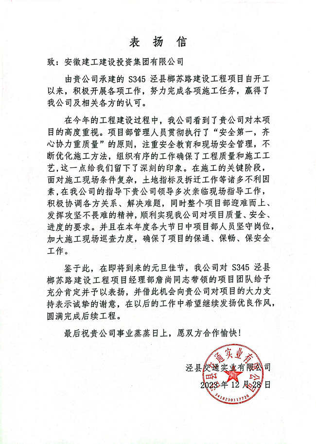 表扬信中指出,S345泾县榔苏路项目自开工以来,项目部管理人员贯彻执行“安全第一,齐心协力重质量”的原则,注重安全教育和现场安全管理,不断优化施工方法,组织有序的工作确保了工程质量和施工工艺;在施工的关键阶段,面对施工现场条件复杂,土地指标及拆迁工作等诸多不利因素,公司领导多次亲临现场指导工作,积极协调各方关系、解决难题,并且在本年度各大节日中项目部人员坚守岗位,加大施工现场巡查力度,确保了项目的保通、保畅、保安全工作。体现了整个项目部迎难而上、发挥攻坚不畏难的精神,顺利实现项目质量、安全、进度的要求。